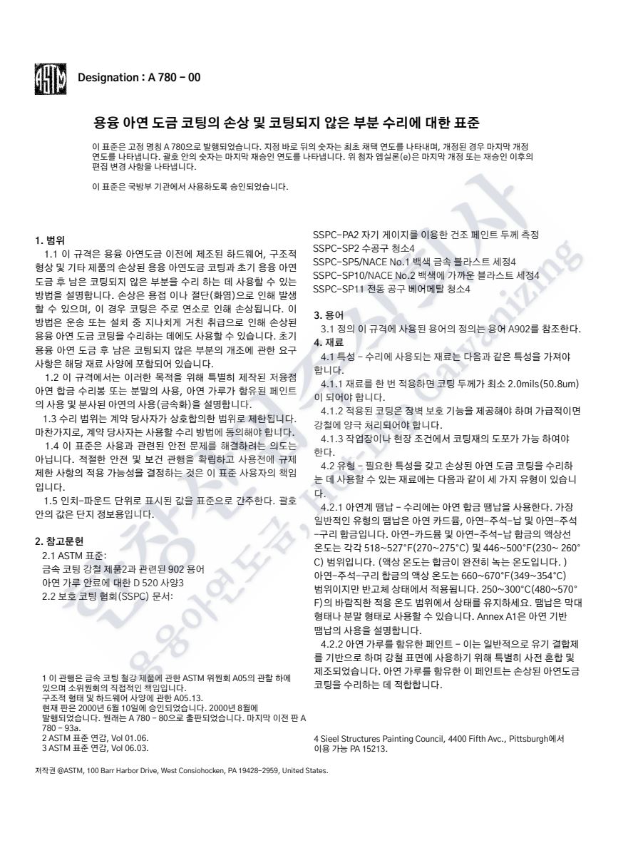ASTM A780 용융 아연 도금 코팅의 손상 및 코팅되지 않은 부분 수리에 대한 표준 지침